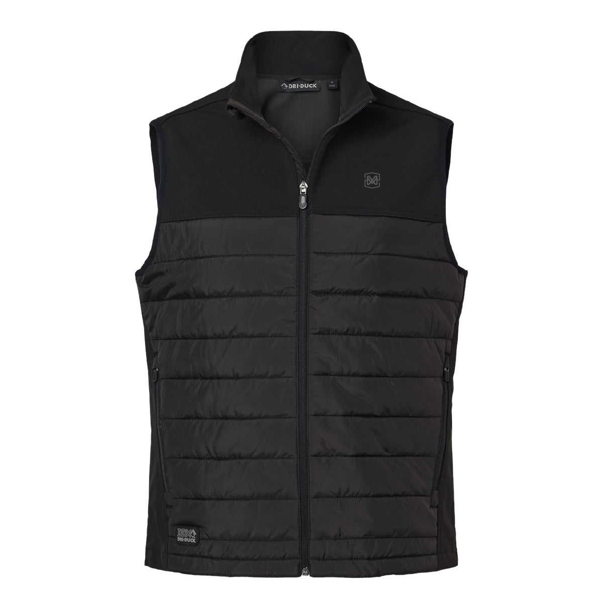 This Dri Duck men's summit soft shell puffer vest comes in a black color, and your choice of logo.