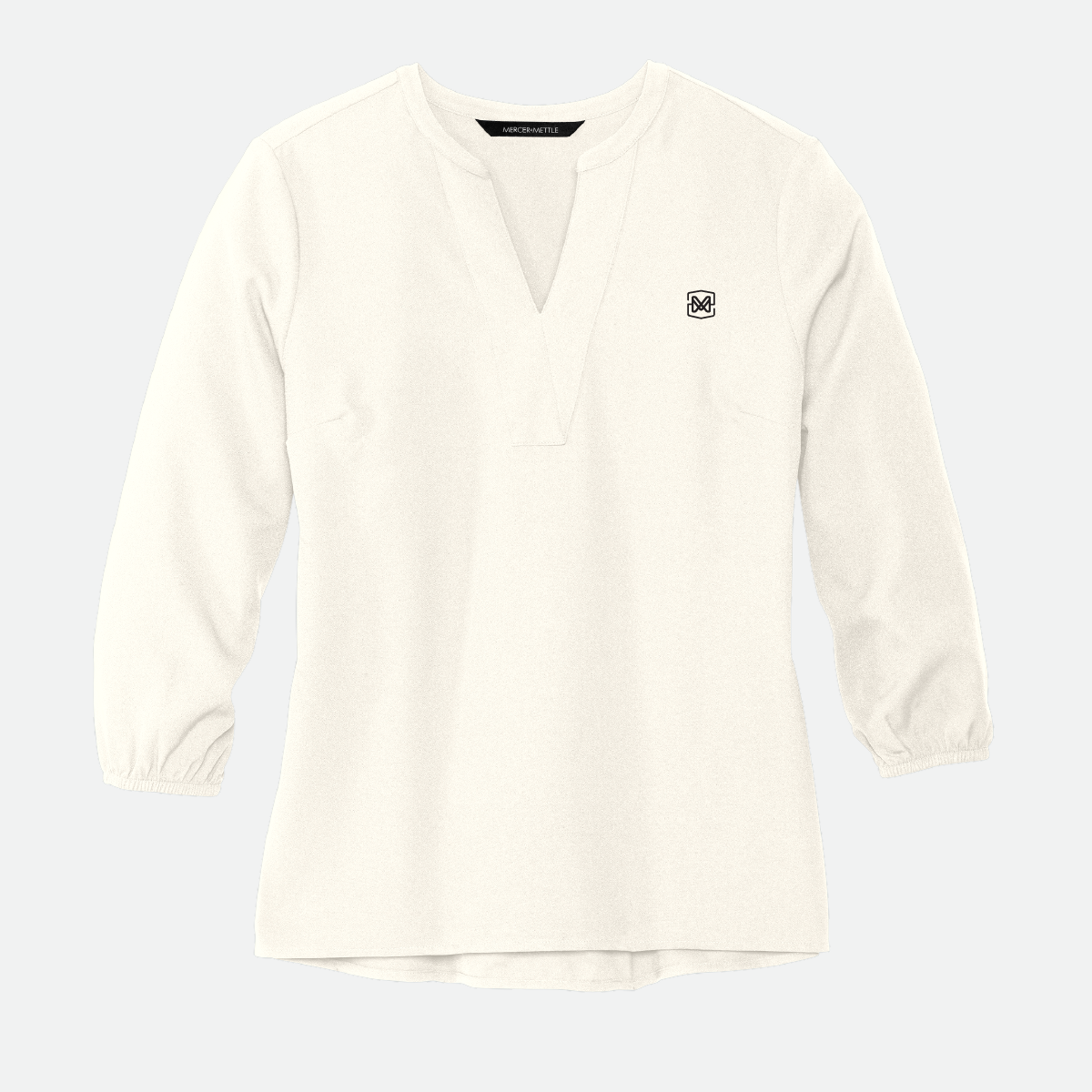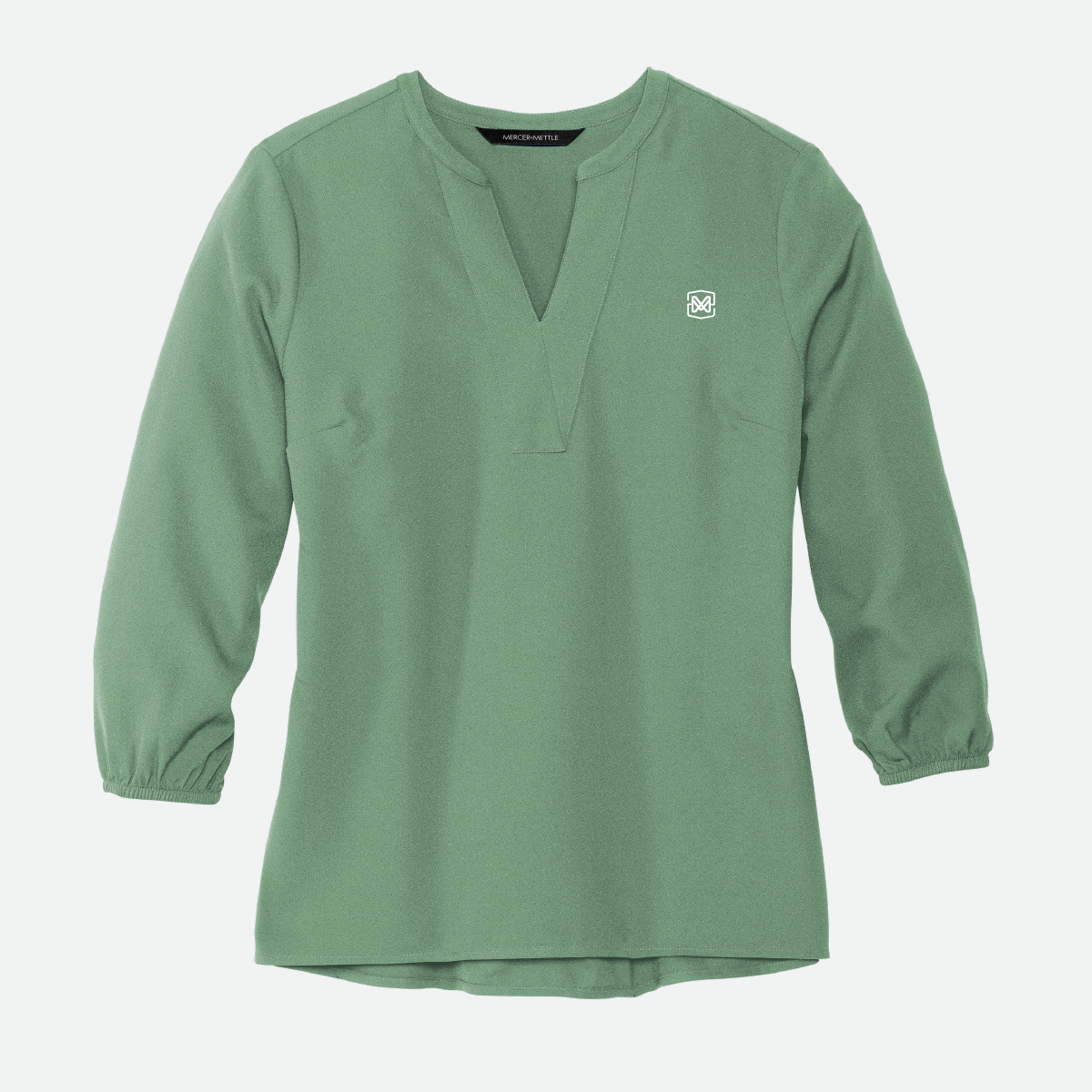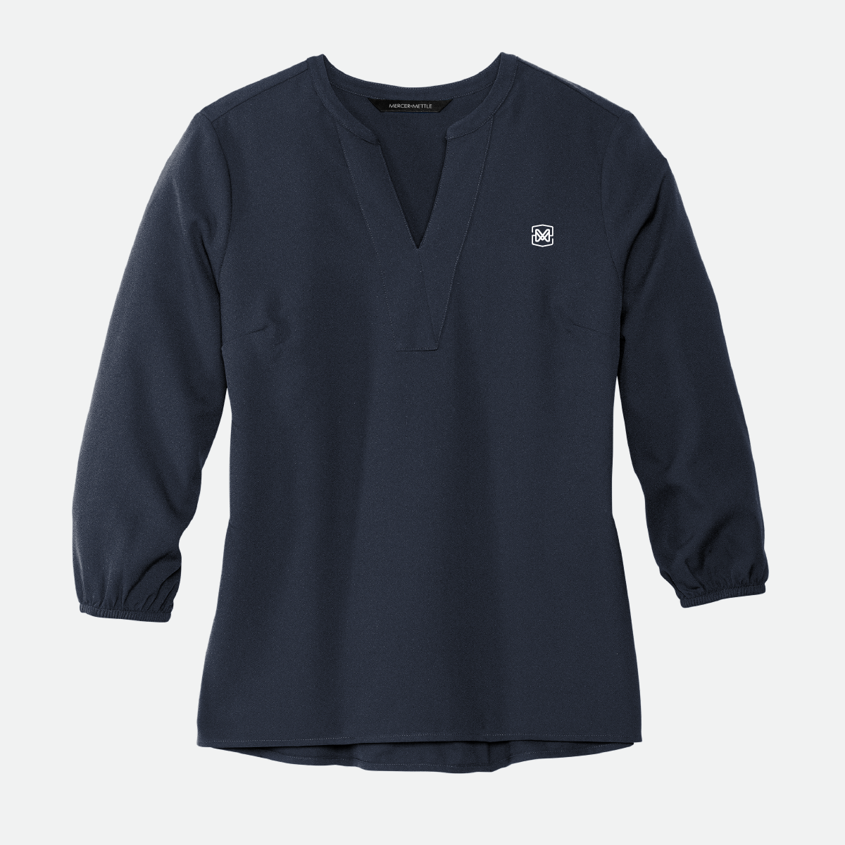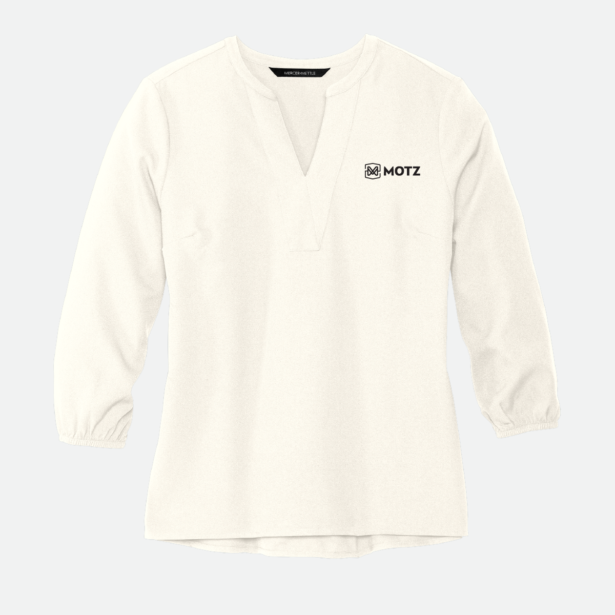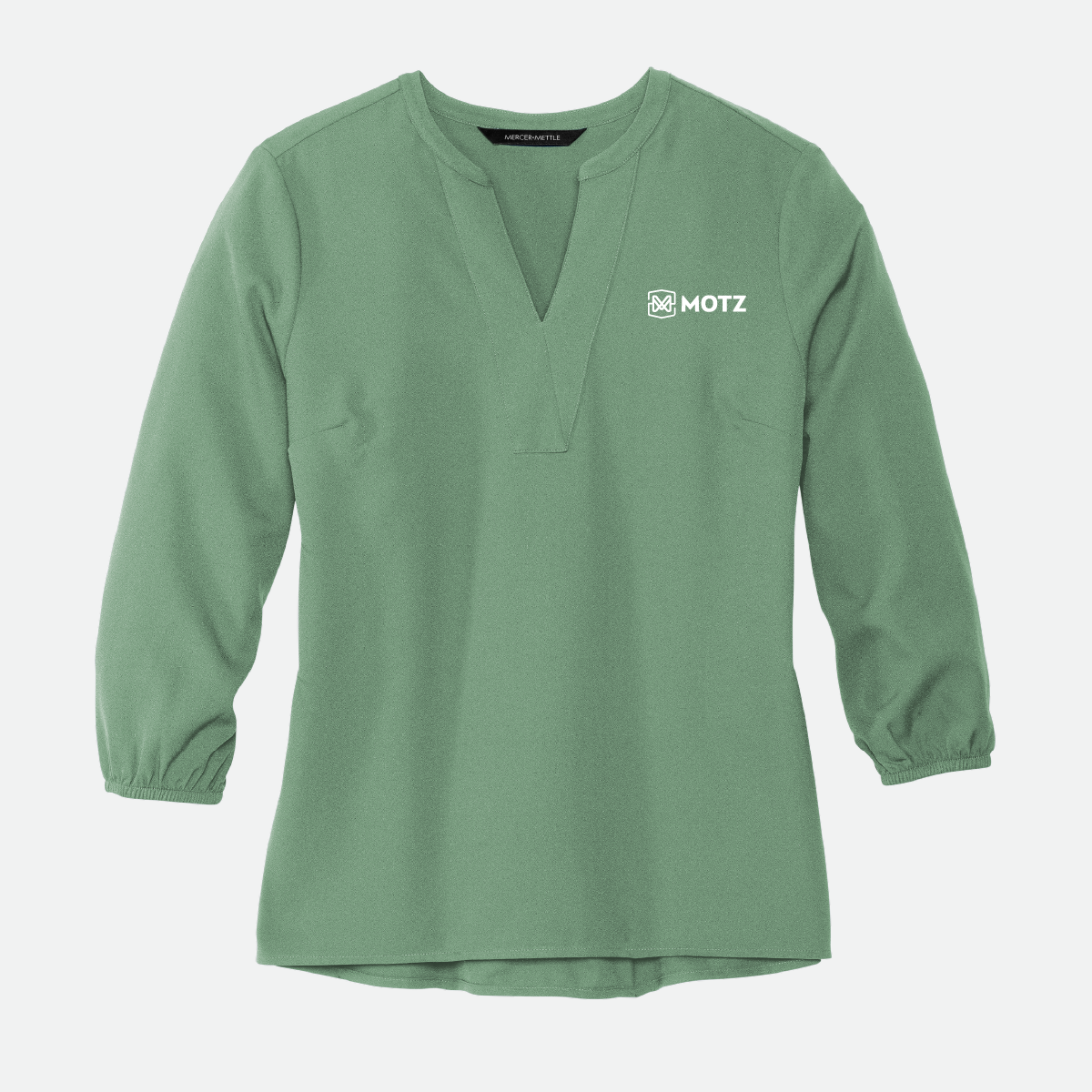This Mercer+Mettle Women's Stretch Crepe 3/4-Sleeve Blouse comes in your choice of color and features the either the Motz logo or icon.